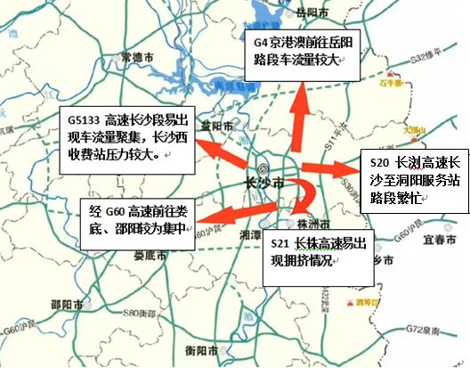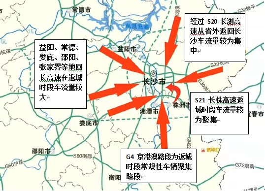 預(yù)計(jì)9月15日返城階段長沙市周邊流量集中的高速有:G5513長張高速、S20長瀏高速、S50長韶婁高速、G60滬昆高速等。