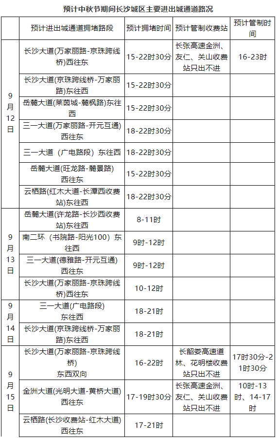預(yù)計(jì)從節(jié)前一天即9月12日下午14時(shí)開始,長沙城區(qū)連接周邊高速的出城道路車流量將持續(xù)較長時(shí)間的增長。例如:連接長張高速的岳麓大道、連接長潭西及長韶婁高速的云棲路等;9月13日上午10時(shí)30分開始,個(gè)別進(jìn)城道路流量將逐步上升。